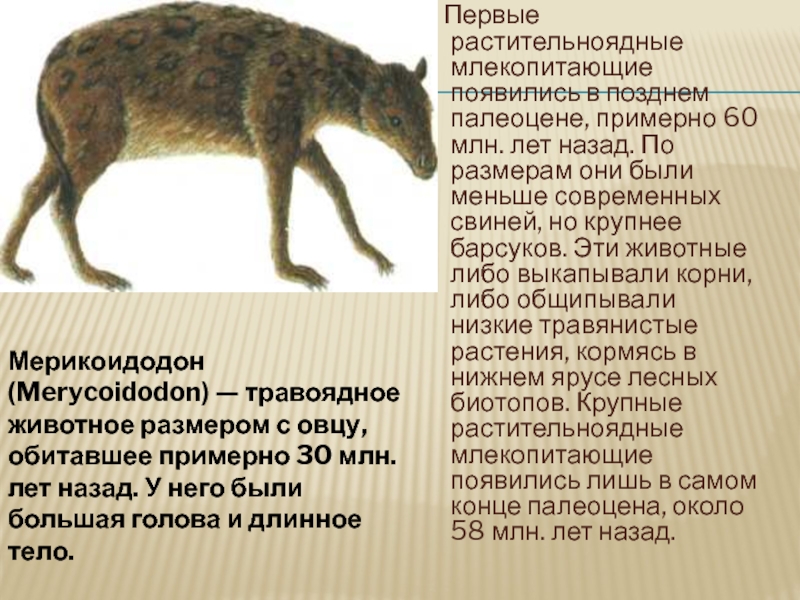 Слайд 11 Первые растительноядные млекопитающие появились в позднем палеоцене, примерно 60