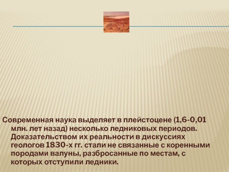 Слайд 31Современная наука выделяет в плейстоцене (1,6-0,01 млн. лет назад) несколько ледниковых