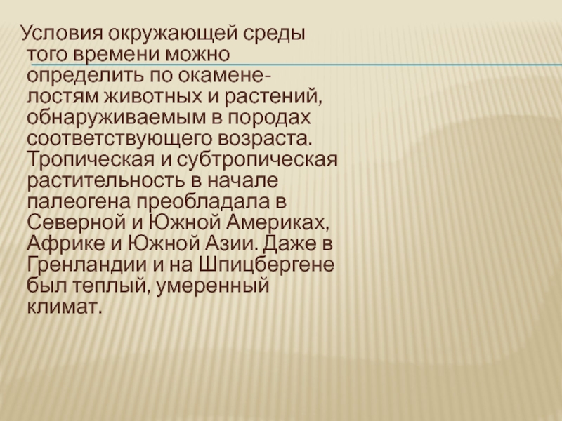 животных и растений, обнаруживаемым в породах соответствующего возраста. Тропическая и субтропическая растительность в начале палеогена преобладала в Северной и Южной Америках, Африке и Южной Азии. Даже в Гренландии и на Шпицбергене был теплый, умеренный климат.