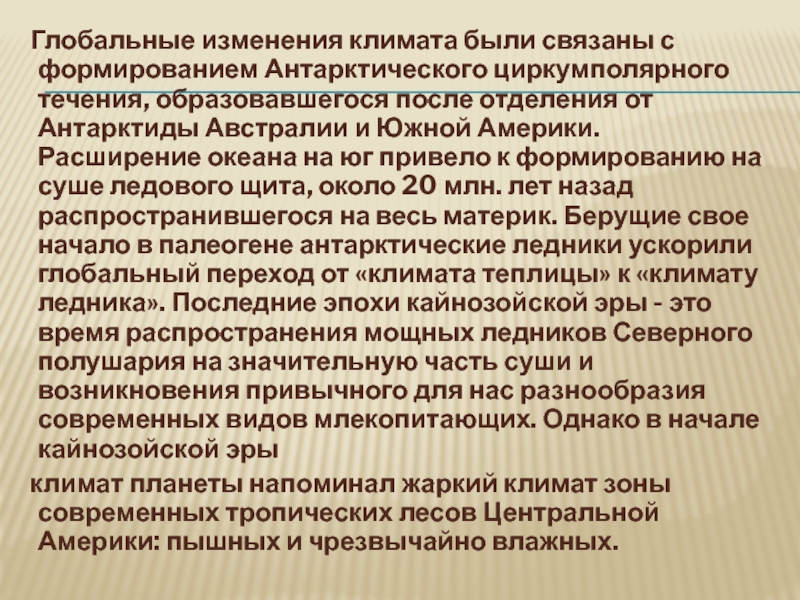 течения, образовавшегося после отделения от Антарктиды Австралии и Южной Америки. Расширение океана на юг привело к формированию на суше ледового щита, около 20 млн. лет назад распространившегося на весь материк. Берущие свое начало в палеогене антарктические ледники ускорили глобальный переход от «климата теплицы» к «климату ледника». Последние эпохи кайнозойской эры - это время распространения мощных ледников Северного полушария на значительную часть суши и возникновения привычного для нас разнообразия современных видов млекопитающих. Однако в начале кайнозойской эры