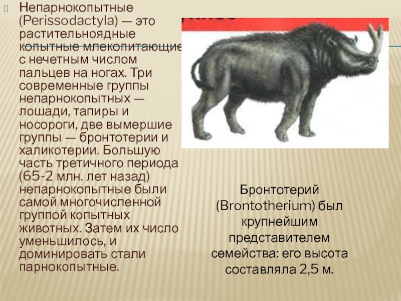 на ногах. Три современные группы непарнокопытных — лошади, тапиры и носороги, две вымершие группы — бронтотерии и халикотерии. Большую часть третичного периода (65-2 млн. лет назад) непарнокопытные были самой многочисленной группой копытных животных. Затем их число уменьшилось, и доминировать стали парнокопытные.