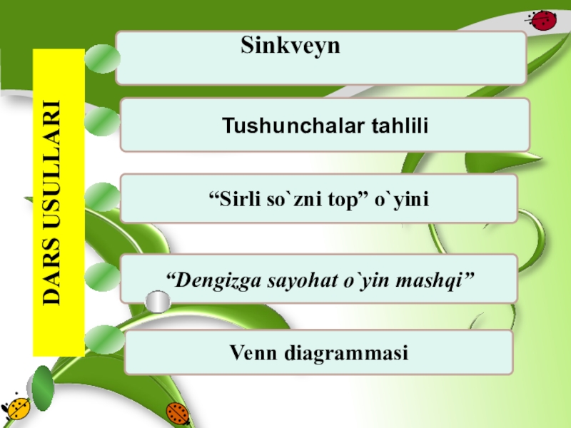 DARS USULLARITushunchalar tahlili“Sirli so`zni top” o`yini Sinkveyn “Dengizga sayohat o`yin mashqi”