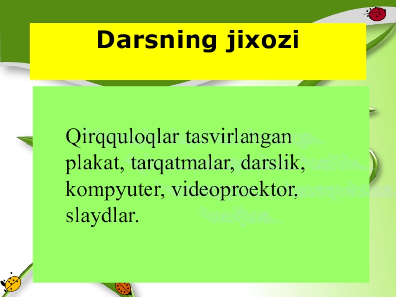 Darsning jixozi Qirqquloqlar tasvirlangan plakat, tarqatmalar, darslik, kompyuter, videoproektor, slaydlar.