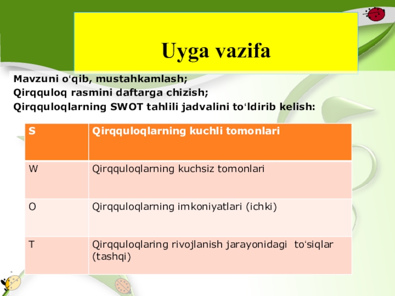Uyga vazifaMavzuni oʻqib, mustahkamlash; Qirqquloq rasmini daftarga chizish;Qirqquloqlarning SWOT tahlili jadvalini toʻldirib kelish: