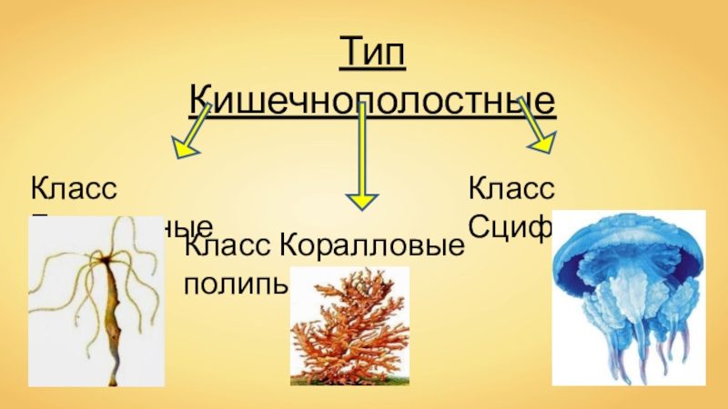 Тип КишечнополостныеКласс ГидроидныеКласс Коралловые полипыКласс Сцифоидные