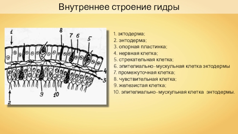 Внутреннее строение гидры1. эктодерма; 2. энтодерма; 3. опорная пластинка; 4. нервная клетка;  5. стрекательная клетка; 6.