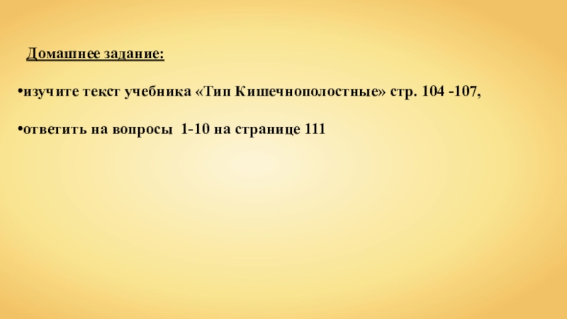 Домашнее задание:изучите текст учебника «Тип Кишечнополостные» стр. 104 -107, ответить на вопросы 1-10 на странице 111