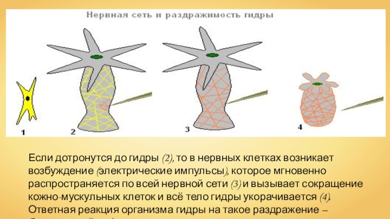 (электрические импульсы), которое мгновенно распространяется по всей нервной сети (3) и вызывает сокращение кожно-мускульных клеток и всё тело гидры укорачивается (4). Ответная реакция организма гидры на такое раздражение – безусловный рефлекс