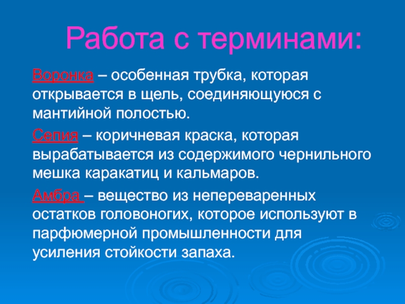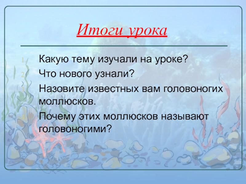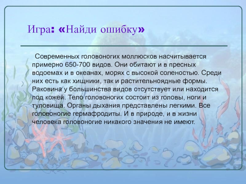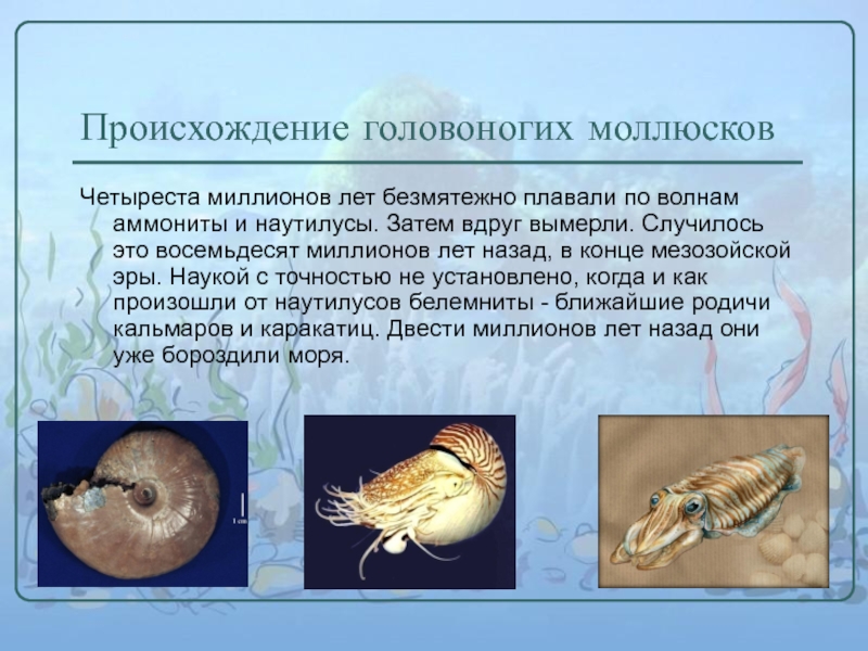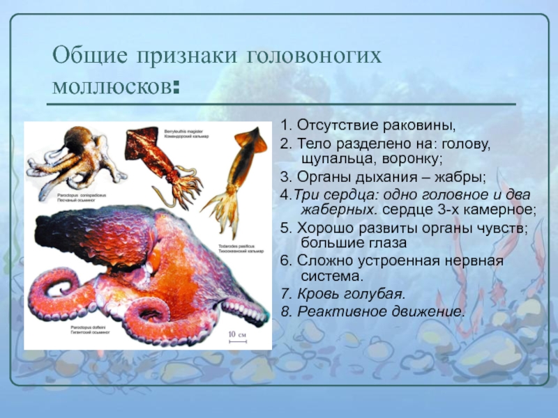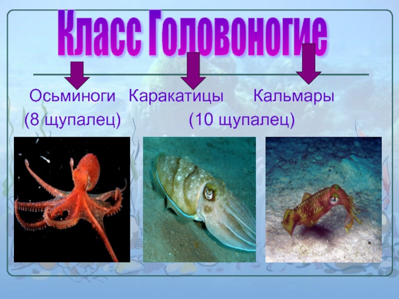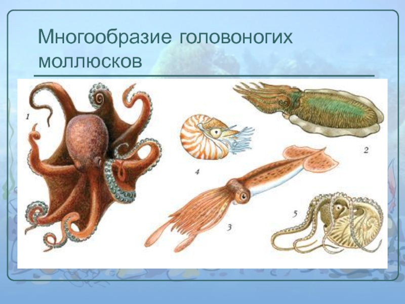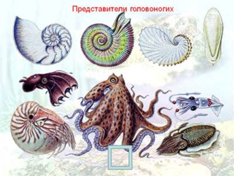 1 см до 5 м. Обитают они в морях и океанах, как в толще воды, так и на дне. К этой группе моллюсков относятся осьминоги, кальмары и каракатицы.