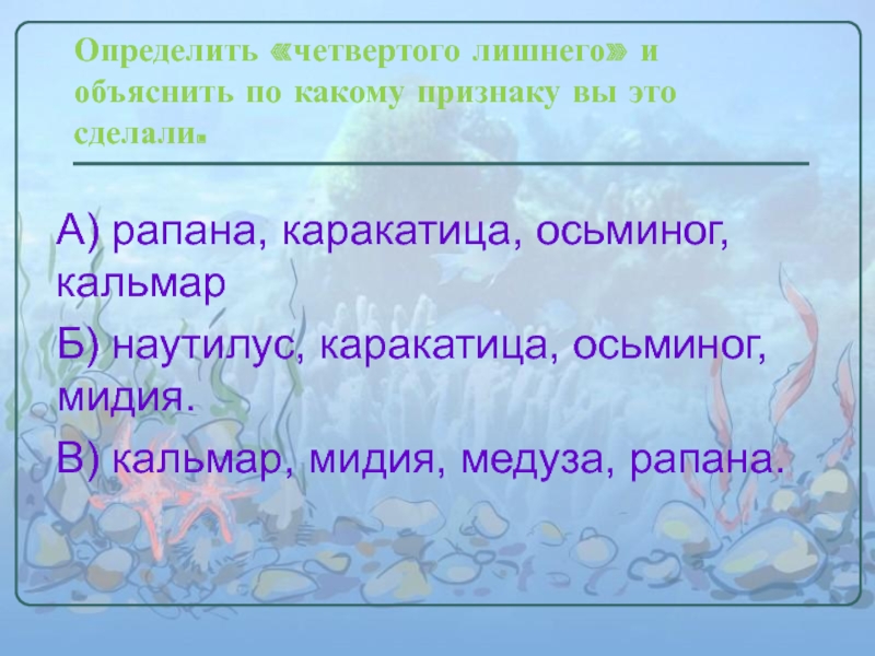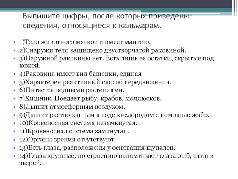 Слайд 38Выпишите цифры, после которых приведены сведения, относящиеся к кальмарам.