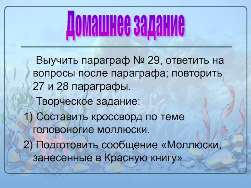 2) Подготовить сообщение «Моллюски, занесенные в Красную книгу»