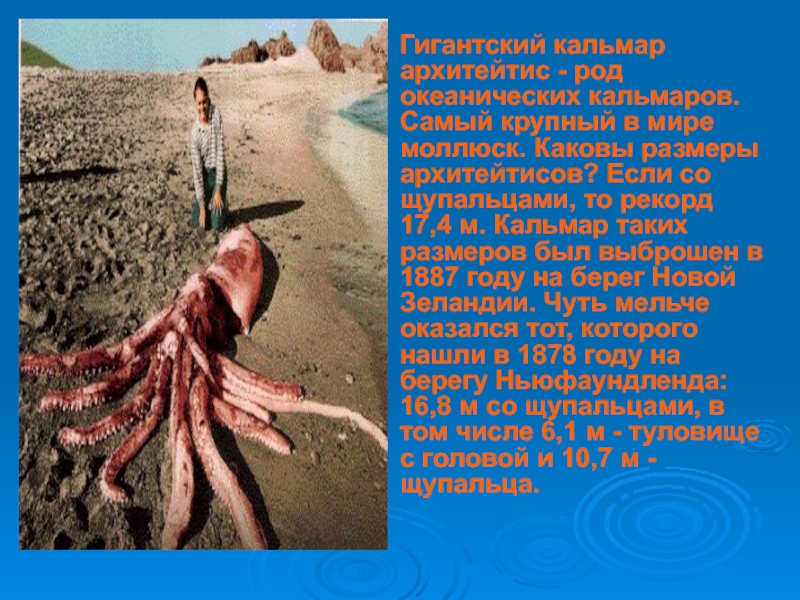 в мире моллюск. Каковы размеры архитейтисов? Если со щупальцами, то рекорд 17,4 м. Кальмар таких размеров был выброшен в 1887 году на берег Новой Зеландии. Чуть мельче оказался тот, которого нашли в 1878 году на берегу Ньюфаундленда: 16,8 м со щупальцами, в том числе 6,1 м - туловище с головой и 10,7 м - щупальца.