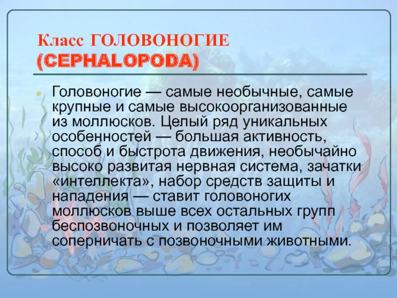 из моллюсков. Целый ряд уникальных особенностей — большая активность, способ и быстрота движения, необычайно высоко развитая нервная система, зачатки «интеллекта», набор средств защиты и нападения — ставит головоногих моллюсков выше всех остальных групп беспозвоночных и позволяет им соперничать с позвоночными животными.