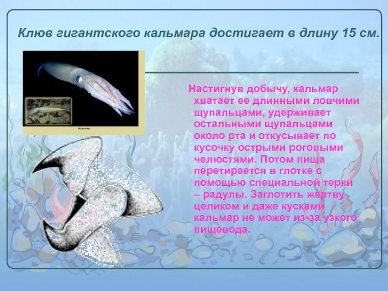 остальными щупальцами около рта и откусывает по кусочку острыми роговыми челюстями. Потом пища перетирается в глотке с помощью специальной терки – радулы. Заглотить жертву целиком и даже кусками кальмар не может из-за узкого пищевода.