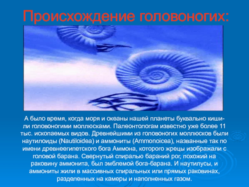 ли головоногими моллюсками. Палеонтологам известно уже более 11 тыс. ископаемых видов. Древнейшими из головоногих моллюсков были наутилоиды (Nautiloidea) и аммониты (Ammonoiсеа), названные так по имени древнеегипетского бога Аммона, которого жрецы изображали с головой барана. Свернутый спиралью бараний рог, похожий на раковину аммонита, был эмблемой бога-барана. И наутилусы, и аммониты жили в массивных спиральных или прямых раковинах, разделенных на камеры и наполненных газом.