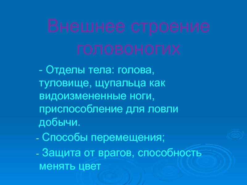 - Отделы тела: голова, туловище, щупальца как видоизмененные ноги,