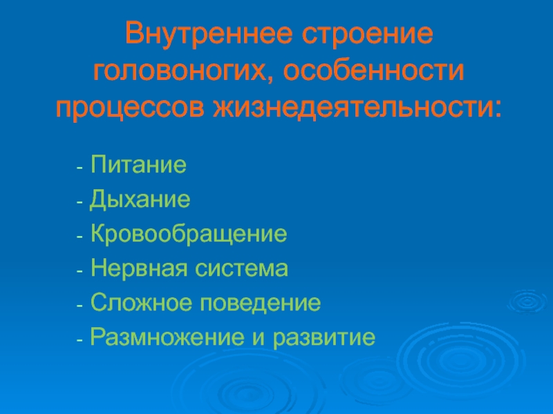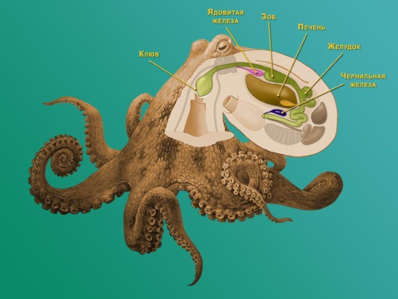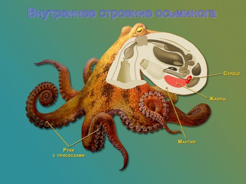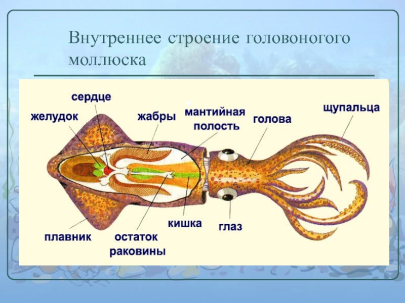Слайд 14Внутреннее строение головоногих, особенности процессов жизнедеятельности: