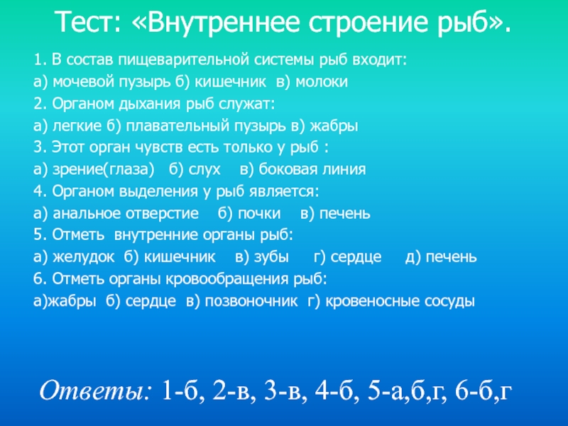 Ответы: 1-б, 2-в, 3-в, 4-б, 5-а,б,г, 6-б,г
