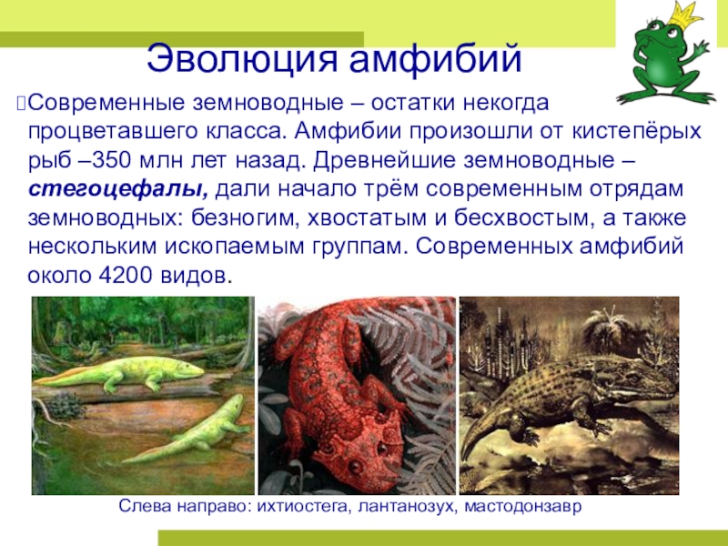 Слева направо: ихтиостега, лантанозух, мастодонзавр
