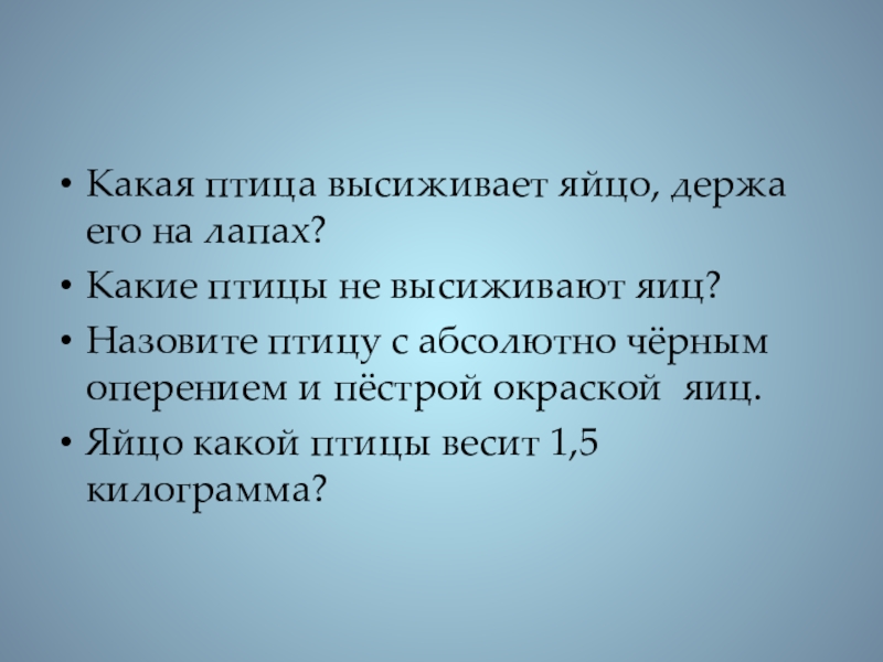 Слайд 8Какая птица высиживает яйцо, держа его на лапах?