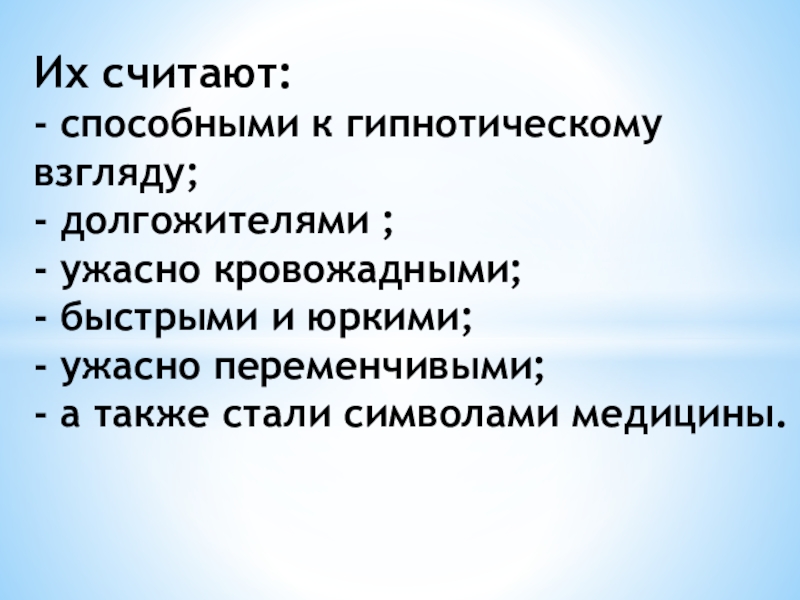 Их считают: - способными к гипнотическому взгляду; - долгожителями ; - ужасно кровожадными; - быстрыми и юркими; - ужасно переменчивыми; - а также стали символами медицины.