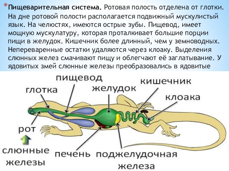 подвижный мускулистый язык. На челюстях, имеются острые зубы. Пищевод, имеет мощную мускулатуру, которая проталкивает большие порции пищи в желудок. Кишечник более длинный, чем у земноводных. Непереваренные остатки удаляются через клоаку. Выделения слюнных желез смачивают пищу и облегчают её заглатывание. У ядовитых змей слюнные железы преобразовались в ядовитые