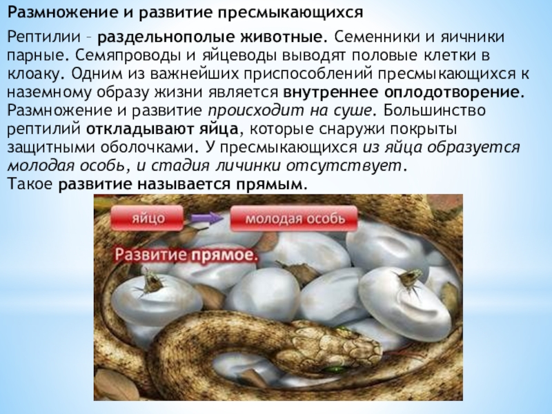 и яйцеводы выводят половые клетки в клоаку. Одним из важнейших приспособлений пресмыкающихся к наземному образу жизни является внутреннее оплодотворение. Размножение и развитие происходит на суше. Большинство рептилий откладывают яйца, которые снаружи покрыты защитными оболочками. У пресмыкающихся из яйца образуется молодая особь, и стадия личинки отсутствует. Такое развитие называется прямым.