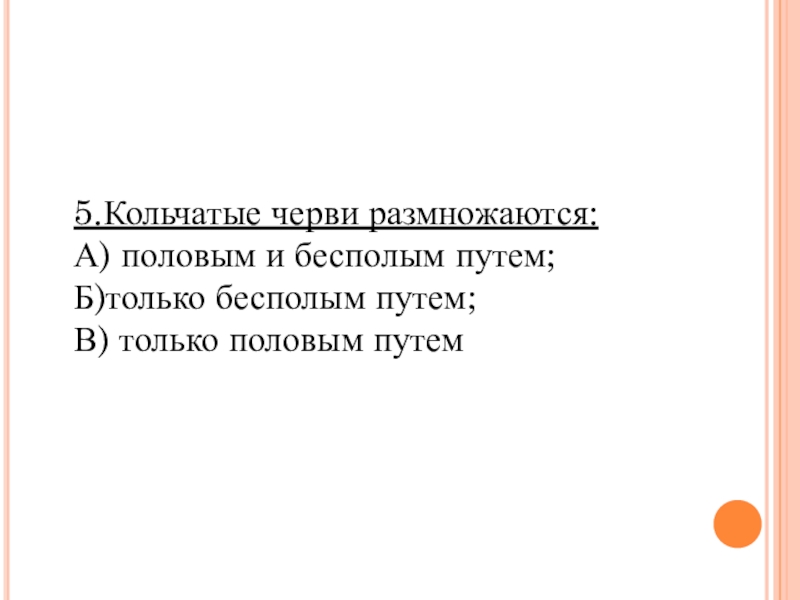 5.Кольчатые черви размножаются:А) половым и бесполым путем;  Б)только бесполым путем;В) только половым путем