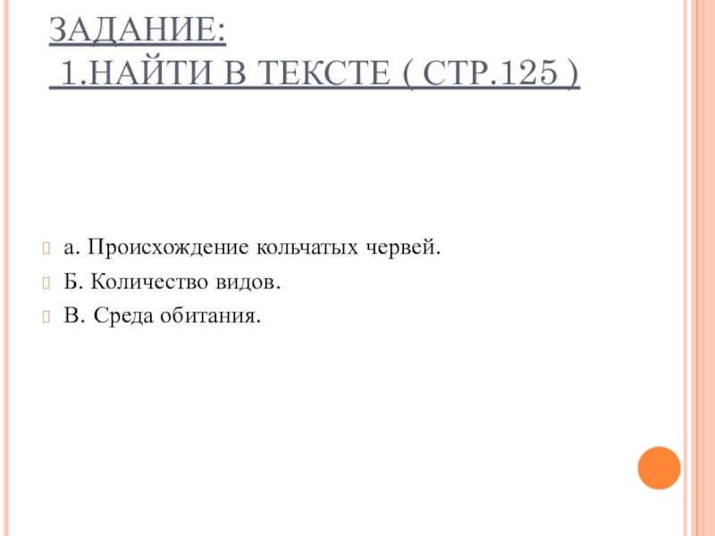 ЗАДАНИЕ:  1.НАЙТИ В ТЕКСТЕ ( СТР.125 ) а. Происхождение кольчатых червей.Б. Количество видов.В. Среда обитания.