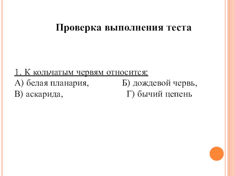 Проверка выполнения теста1. К кольчатым червям относится:А) белая планария,       Б) дождевой