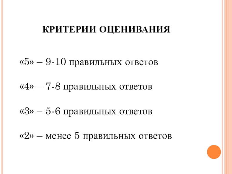КРИТЕРИИ ОЦЕНИВАНИЯ«5» – 9-10 правильных ответов«4» – 7-8 правильных ответов«3» – 5-6 правильных ответов«2» – менее 5