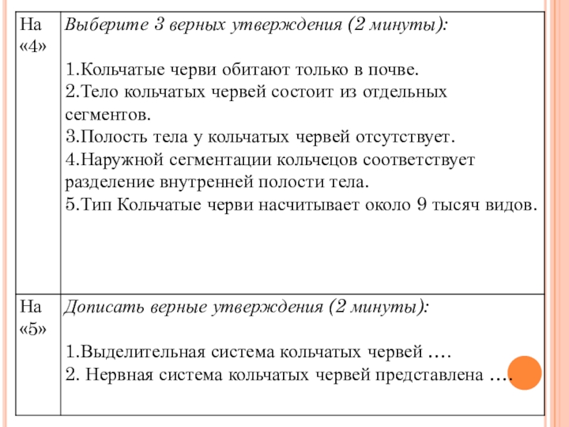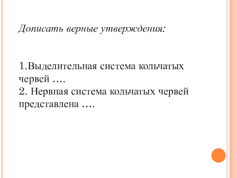 Дописать верные утверждения:1.Выделительная система кольчатых червей ….2. Нервная система кольчатых червей представлена ….