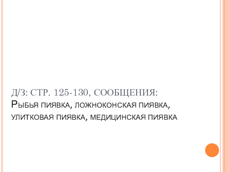 Д/З: СТР. 125-130, СООБЩЕНИЯ: Рыбья пиявка, ложноконская пиявка, улитковая пиявка, медицинская пиявка