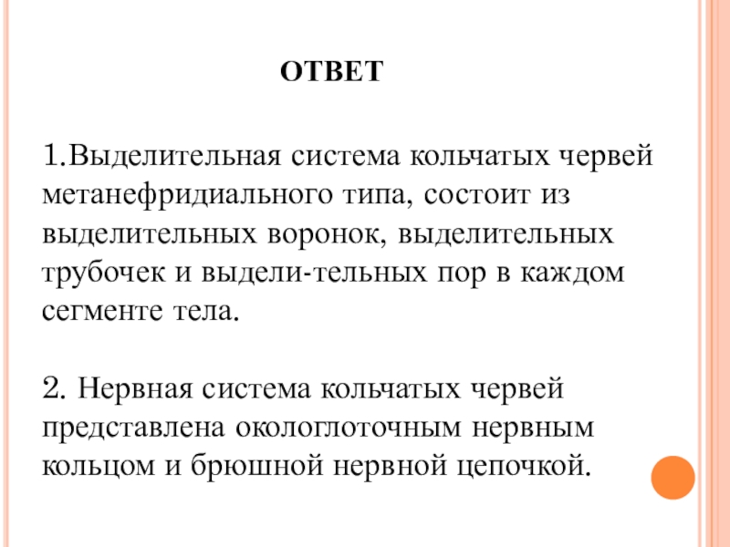 ОТВЕТ1.Выделительная система кольчатых червей метанефридиального типа, состоит из выделительных воронок, выделительных трубочек и выдели-тельных пор в каждом