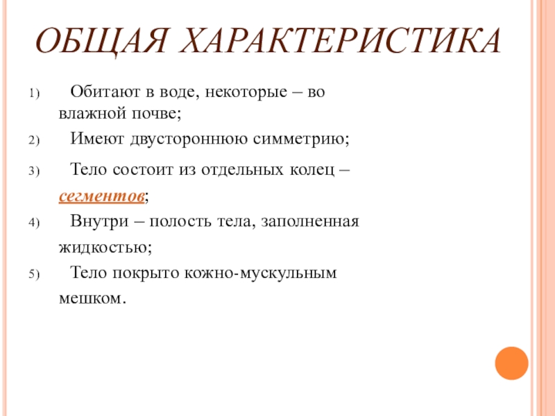 ОБЩАЯ ХАРАКТЕРИСТИКАОбитают в воде, некоторые – во   влажной почве;Имеют двустороннюю симметрию;Тело состоит из отдельных колец