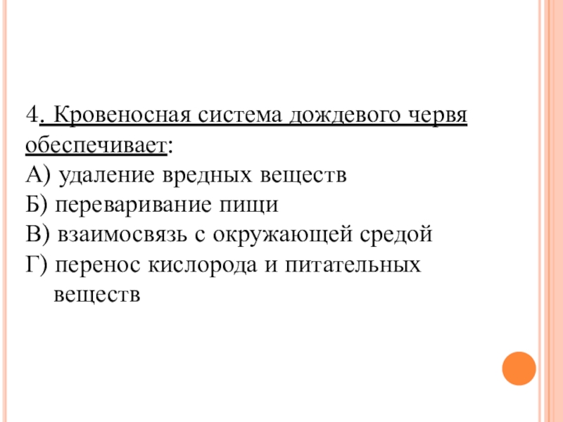 4. Кровеносная система дождевого червя обеспечивает:А) удаление вредных веществ      Б) переваривание пищиВ)