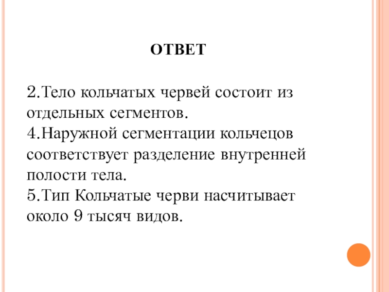 ОТВЕТ2.Тело кольчатых червей состоит из отдельных сегментов.4.Наружной сегментации кольчецов соответствует разделение внутренней полости тела.5.Тип Кольчатые черви насчитывает