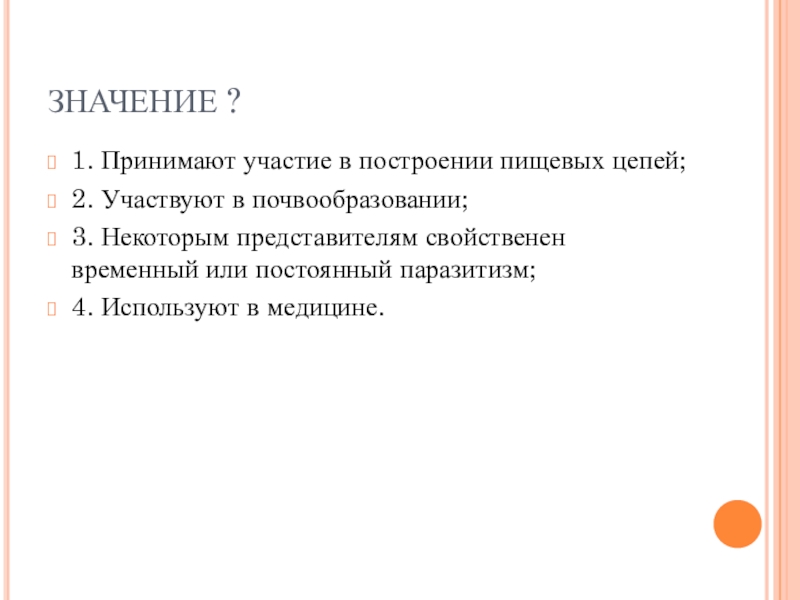 ЗНАЧЕНИЕ ?1. Принимают участие в построении пищевых цепей;2. Участвуют в почвообразовании; 3. Некоторым представителям свойственен временный или
