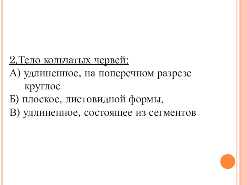 2.Тело кольчатых червей:А) удлиненное, на поперечном разрезе    круглоеБ) плоское, листовидной формы. В) удлиненное, состоящее