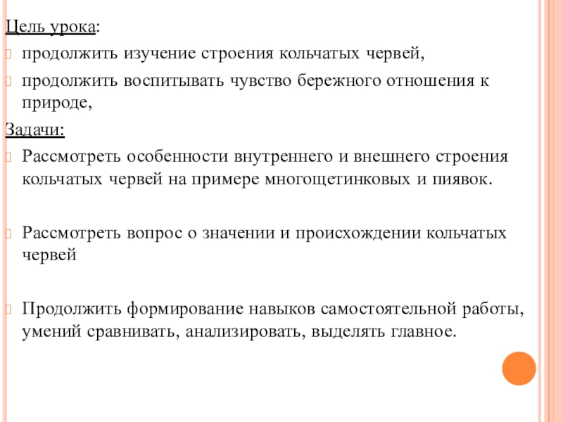 Цель урока: продолжить изучение строения кольчатых червей,продолжить воспитывать чувство бережного отношения к природе,Задачи:Рассмотреть особенности внутреннего и внешнего