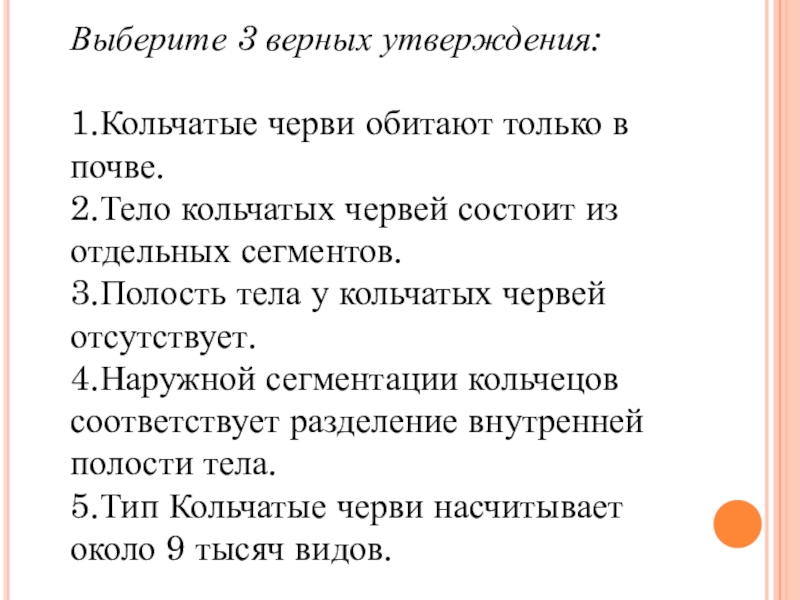 Выберите 3 верных утверждения:1.Кольчатые черви обитают только в почве.2.Тело кольчатых червей состоит из отдельных сегментов.3.Полость тела у