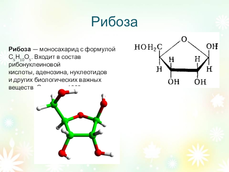 РибозаРибоза — моносахарид с формулойС5Н10О5. Входит в состав рибонуклеиновойкислоты, аденозина, нуклеотидов и других биологических важных веществ. Открыта в
