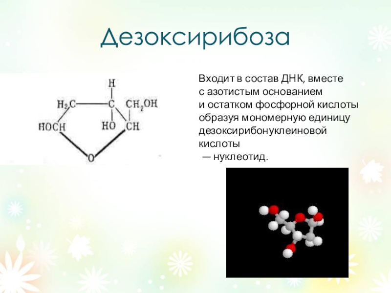 ДезоксирибозаВходит в состав ДНК, вместес азотистым основанием и остатком фосфорной кислотыобразуя мономерную единицу дезоксирибонуклеиновой кислоты — нуклеотид.