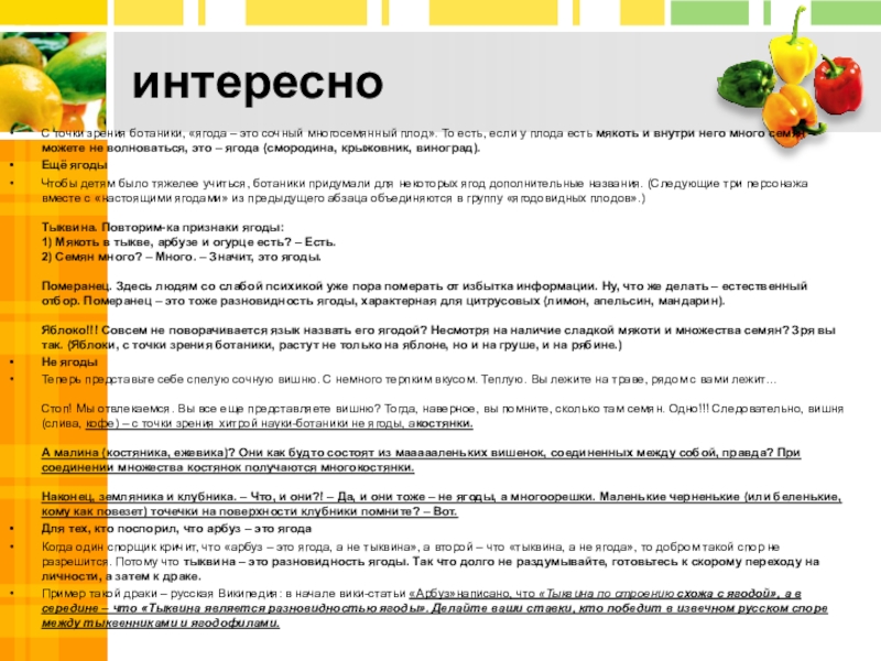Пример такой драки – русская Википедия: в начале вики-статьи «Арбуз»написано, что «Тыквина по строению схожа с ягодой», а в середине – что «Тыквина является разновидностью ягоды». Делайте ваши ставки, кто победит в извечном русском споре между тыквенниками и ягодофилами.