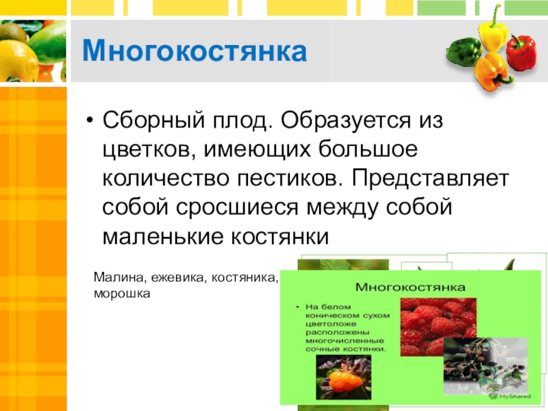 А малина (костяника, ежевика)? Они как будто состоят из маааааленьких вишенок, соединенных между собой, правда? При соединении множества костянок получаются многокостянки.