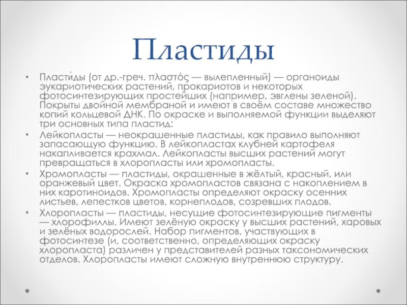 и некоторых фотосинтезирующих простейших (например, эвглены зеленой). Покрыты двойной мембраной и имеют в своём составе множество копий кольцевой ДНК. По окраске и выполняемой функции выделяют три основных типа пластид: