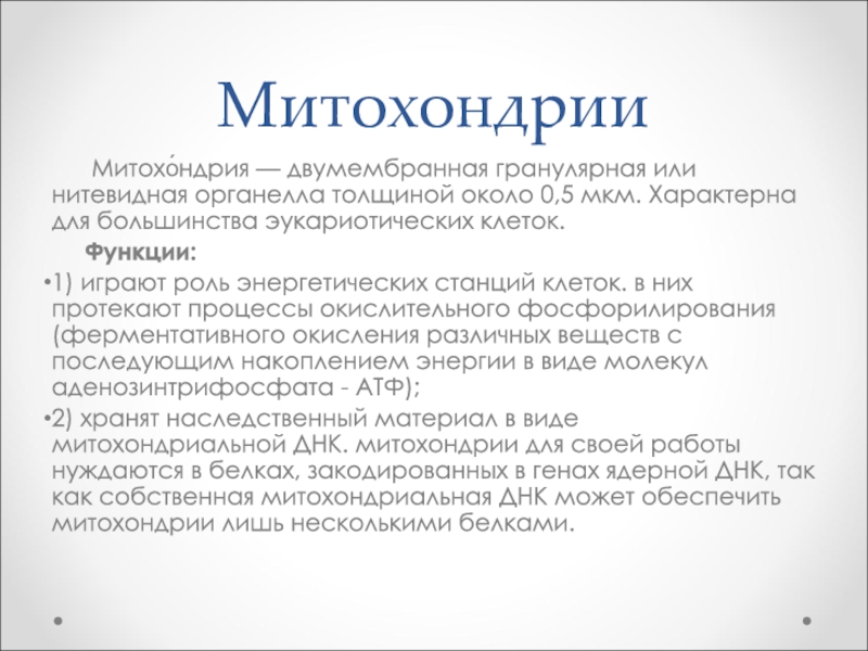 1) играют роль энергетических станций клеток. в них протекают процессы окислительного фосфорилирования (ферментативного окисления различных веществ с последующим накоплением энергии в виде молекул аденозинтрифосфата - АТФ);
