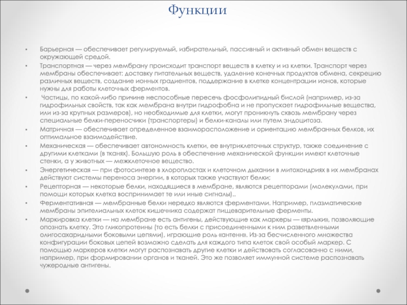 Барьерная — обеспечивает регулируемый, избирательный, пассивный и активный обмен веществ с