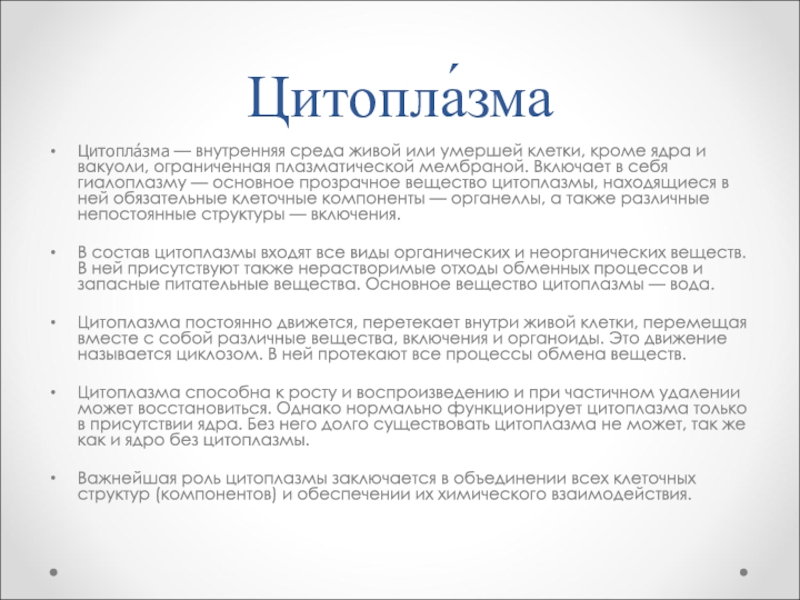 вакуоли, ограниченная плазматической мембраной. Включает в себя гиалоплазму — основное прозрачное вещество цитоплазмы, находящиеся в ней обязательные клеточные компоненты — органеллы, а также различные непостоянные структуры — включения.
