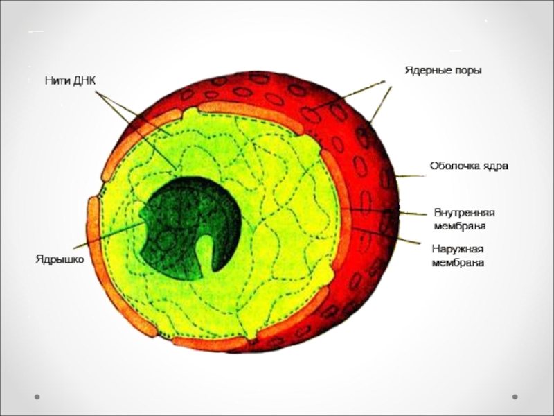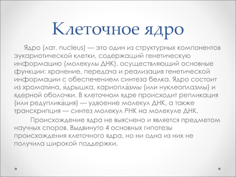структурных компонентов эукариотической клетки, содержащий генетическую информацию (молекулы ДНК), осуществляющий основные функции: хранение, передача и реализация генетической информации с обеспечением синтеза белка. Ядро состоит из хромати́на, я́дрышка, кариопла́змы (или нуклеоплазмы) и ядерной оболочки. В клеточном ядре происходит репликация (или редуплика́ция) — удвоение молекул ДНК, а также транскрипция — синтез молекул РНК на молекуле ДНК.